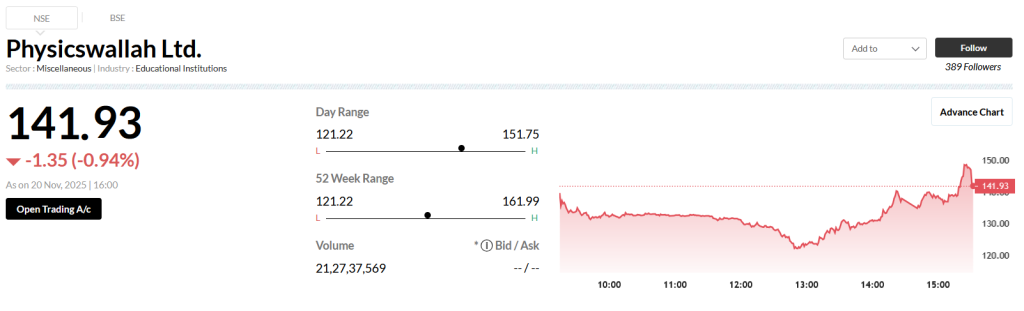 PhysicsWallah made a strong entrance on the stock market, listing at Rs 145 per share on the NSE on November 18 more than 33 percent above its IPO issue price. The momentum continued through the first trading session, with the stock ending the day at Rs 156.49, giving investors a gain of nearly 44 percent over the IPO price.
